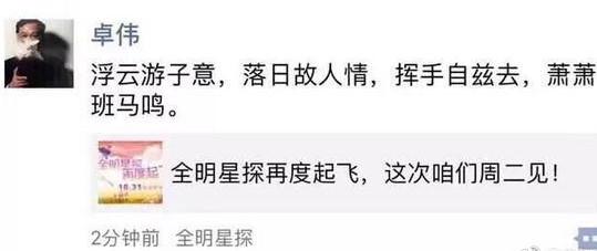 卓偉宣布“全民星探”重新起飛,此外還選擇一首詩,“浮云游子意,落日故人情。 揮手自茲去,蕭蕭斑馬鳴。”這是出自于唐代詩人李白的《送友人》 ,描述不舍朋友離去,仍要各奔前程,借此抒發(fā)離別的憂愁心情。