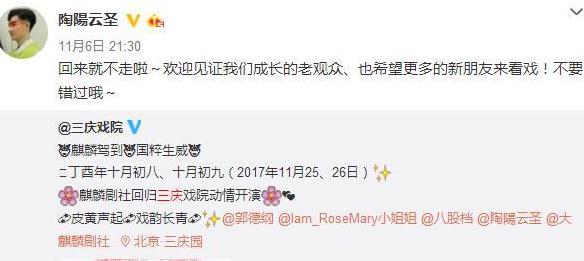 緊接著,陶陽(yáng)也多次表示,麒麟劇社即將回歸三慶園,這個(gè)他們闊別了一年之久的地方。明星經(jīng)紀(jì)公司小編關(guān)注到,11月6日,回歸的日期終于確定,他們將在11月25、26日,正式恢復(fù)三慶園的演出,而陶陽(yáng)也在微博上表示,這次回來(lái),就不走了。