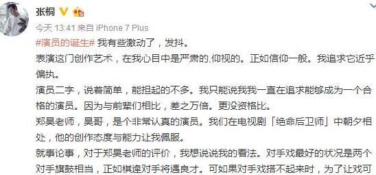 在這邊長文中,張桐直言“表演是水漲船高,而不是水落石出。石頭出不了頭只能怪它自己不夠高,而不能怪不放水。請(qǐng)記?。貉輪T有演員的尊嚴(yán)與道德!”
