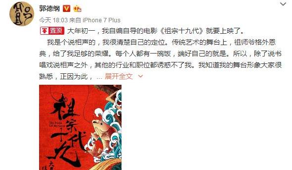 ? 經(jīng)紀(jì)公司:郭德綱自編自導(dǎo)《祖宗十九代》,微博長文大談心路歷程-高娛傳媒